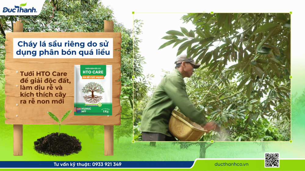 - Cháy lá sầu riêng do sử dụng phân bón quá liều: Tình trạng này xảy ra khi bón quá nhiều phân vô cơ, đặc biệt là NPK có hàm lượng lân và kali cao. Khi đó, rễ cám bị cháy, dẫn đến chóp lá và rìa lá cháy khô. Khi cây bị ngộ độc phân, nhà vườn nên tưới phân hữu cơ HTO Care – Humic My để giải độc đất, làm dịu rễ và kích thích cây ra rễ non mới.